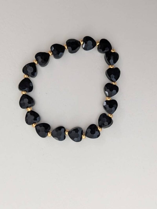 Armbanje met zwarte glazen facet hartjes en 3 mm miyuki kralen. Het armbandje is van elastiek en daarom makkelijk om te doen.