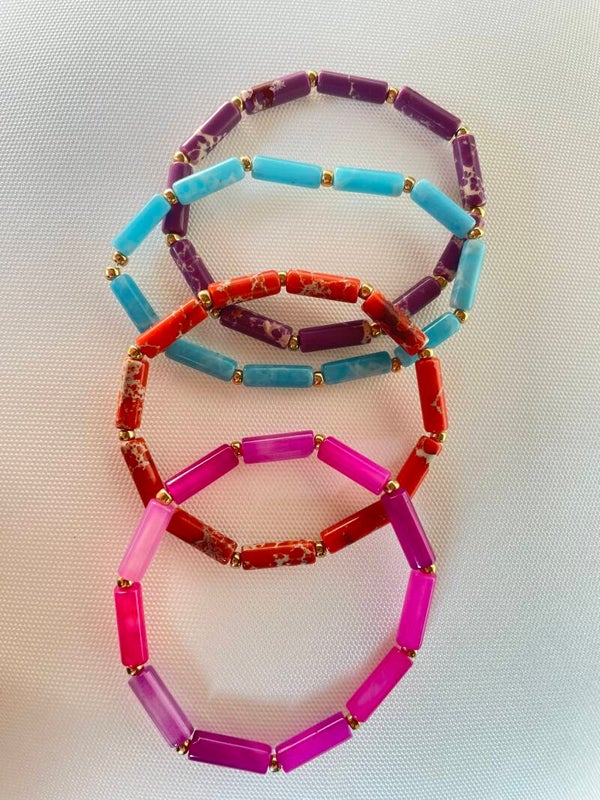 Deze armband hebben we in 4 verschillende kleuren. Leuk te combineren met andere armbanden. Lengte: 17 cm