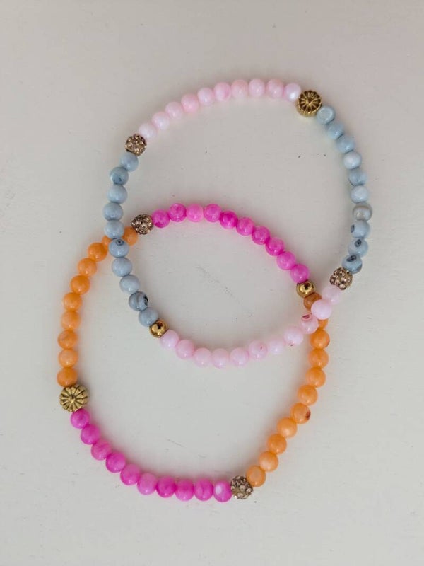 Armband met 4 mm kralen en een roestvrijstalen kraal en bloemetje ertussen.