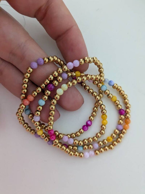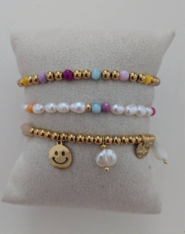 Armband met gouden roestvrij stalen kralen afgewisseld met diverse vrolijk kleuren.
