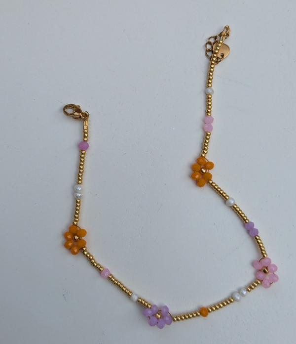 Enkelbandje van kralen met bloemen. Beschikbaar in het goud en zilver.