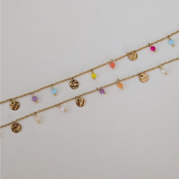 Enkelbandje van een roestvrij kettinkje met ronde bedels en kralen. In overleg kan dit ook met andere kleur kralen of in 1 kleur.
