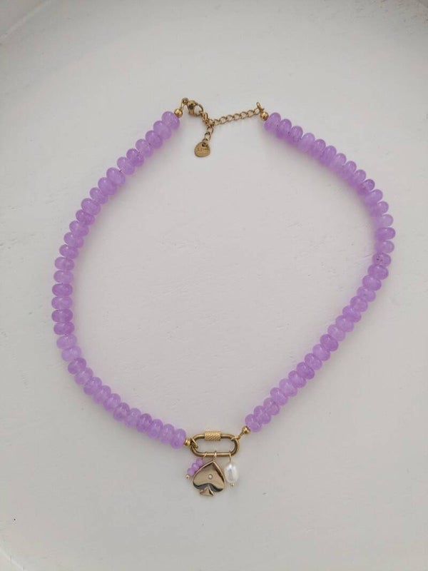 Ketting van natuursteen kralen met 3 leuke bedels. De bedels kunnen eraf gehaald worden. Er kunnen ook andere bedels aan of alleen een sluiting.