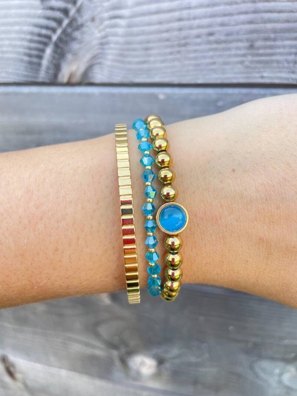 Armband met 4 mm glaskralen en gouden miyuki kralen. Leuk te combineren met andere armbandjes en je voegt al snel een leuk kleuraccent toe.
